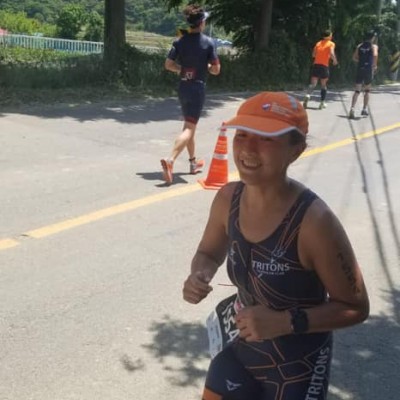 The ride was the highlight of my race. When I was riding, I didn’t think of anything else but maintaining my power. It was a pretty technical course with 6 u-turns, some single-laned tight sections, lots of people drafting, and roly poly curvy roads. I probably rode out of aero more often than in. However, I had so much fun, especially on the descents! It’s this overwhelming sense of freedom and I loved it! There was really never a dull moment on the ride. Volunteers of all ages, ringing cow bells, were cheering “fighting fighting” the whole route and they had closed all the roads just for us! The aid stations were oddly spaced out with the first one in around 36K and the last one pretty close to the final (which I skipped), but the volunteers were smiling and cheering. At the last 15K, I felt awesome, I basically left what I could on the road and burned rubber home, passing tons of people similar to my Taitung experience. I was happy to see Grace already on her run and Connie and Isabel as I made my way back into T2. My only one hiccup was that I dropped a gel out of my bento box and knew I needed to make up the calories somewhere… but other than that, best ride – ever!