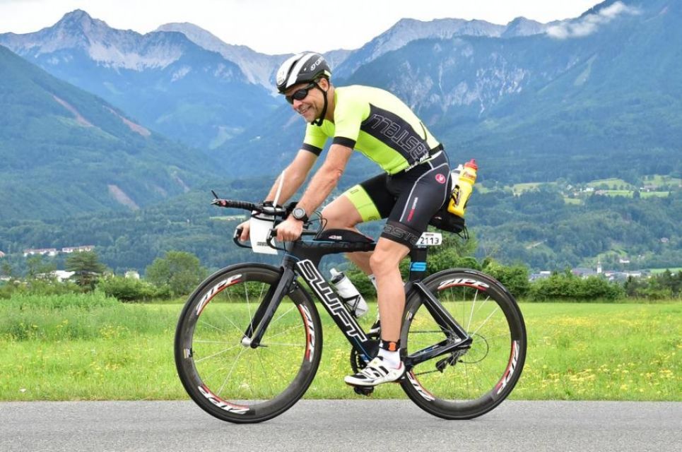 Race day dawned a chilly 16 degrees which was a shock to the system after HK but brought the welcome news that the lake temperature was 22.5 degrees and therefore wetsuit legal. I was feeling confident so seeded myself in the second start pen with the 1:10-1:15 group. The gun went off at 6:50am and I got through the gate around 7am and immediately realized that the swim was going to be a bunfight as they got all the AG athletes through the gates in 25 minutes. Lots of jostling but I managed to find some faster feet and felt good - the usual problem in Austria is the rising sun in your eyes on the way to the finish but a bit of cloud helped and I was delighted to finish with a 1:16 (thanks to Fen and AM for the massive improvement since I moved to HK!).