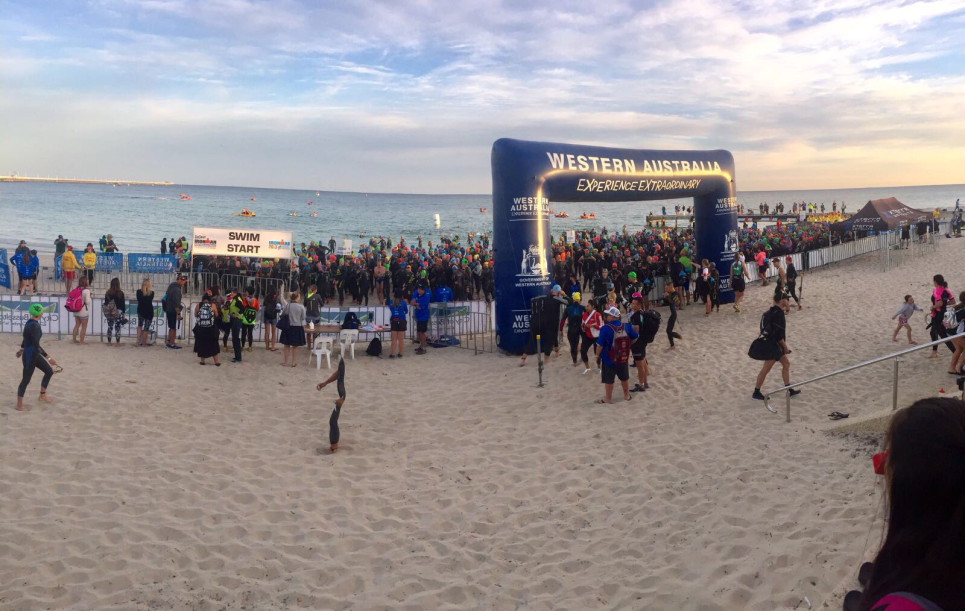 The morning was looking to be stellar. The air temp started at 19C and predicted to hit highs of 34C. We all woke at 3:30am to make my transition set up and the place was already alive with both half and full participants. The swim start was self seeded and I put myself at 45 minutes. To hide my nervousness, I started chatting up anyone who would listen to me. I met a crazy big Indonesian contingent, whom many were running their first 70.3 and a few who were doing the relay. I have to admit, the seeding was very well organized with 5-7 racers released into the water at a time. By the time half the 70.3 racers were in the water, that’s when you felt something strange was going on. The kayaks and canoes were in frantic regrouping, whistled were blowing, and the “on deck” lifeguards had one arm up in the air. You could hear speculation weave through the crowd - Shark? Shark? Great white? Then, in a very organized fashion, the kayaks began to push the swimmers back towards the jetty. There were ladder exits along the jetty and it was quite obvious that everyone was sprinting to them. “The swim is cancelled,” the announcer shouted over the microphones and disappointment rippled through the crowd. For Laurent and Tracy, they thought I’d gone in the water and started to disperse and prepare for Laurent’s full start, but then all the supporters came back when the beach got a little chaotic. We were told to strip off our wet suits and wait. And wait we did...