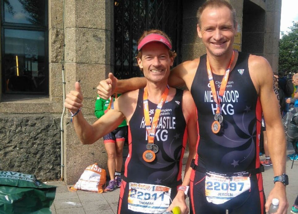 The bad-ish: water temperature was 18 Celsius, which was “refreshing”, but doable in a suit (not a hero in cold water…). The bike course was kind of crazy – lots of double-backs, cobblestones, and speed bumps. Bunch of ambulances chasing around the course as a result. Got a 2 minute drafting penalty for pausing to say hi to a Team Japan member… Harshness…